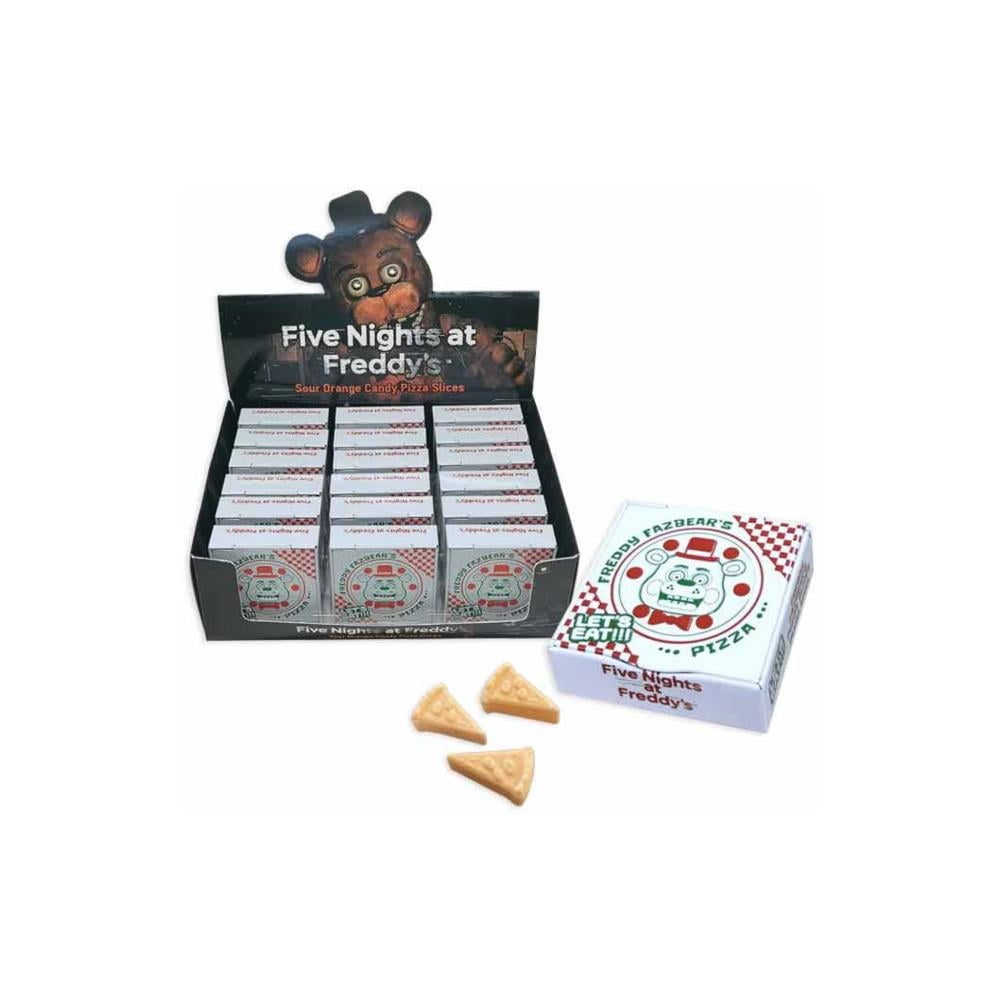 استمتع بقطعة بيتزا من بيتزا فريدي فازبيرز. ولأنك لا تستطيع تناول البيتزا الأصلية، استمتع بشرائح بيتزا حلوى البرتقال الحامض في علب "خمس ليالٍ من فريدي"